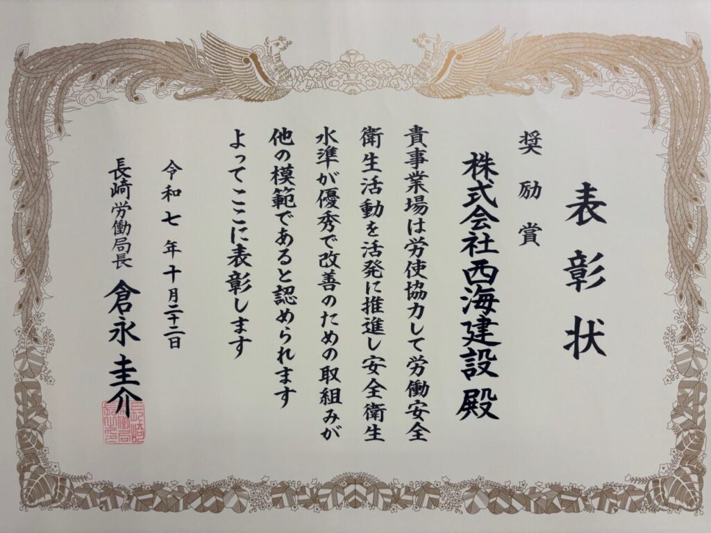 令和7年度長崎県産業安全衛生大会に於いて、当社の労使協力による労働安全衛生活動の水準が良好で改善のための取組みが他の模範と認められ、奨励賞を受賞しました。