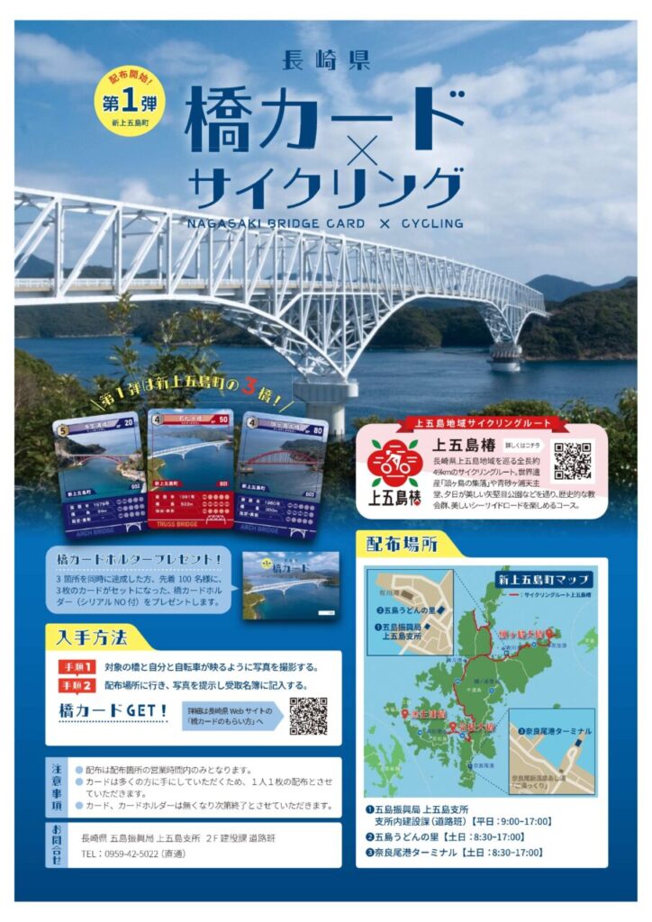 長崎県により、県内の橋梁を紹介する「橋カード」が制作されました。第一弾は新上五島町の橋梁がテーマとなっており、当社(西海建設・坂本組JV)が施工した「若松大橋」もカードとして採用されています。橋の魅力や地域の景観を楽しんでいただける内容となっています。興味のある方は、長崎県が公開している下記URLより、ぜひご覧ください。↓↓↓上五島支所では「橋カード」を配布しています!こちら