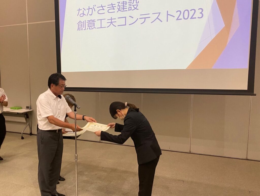 7月26日(水)に大村市で開催された「ながさき建設 創意工夫コンテスト2023」において、弊社の若手女性技術者(入社8年目)が「最優秀賞」を受賞しました。
